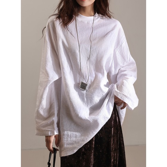 2025春秋亚麻麻料圆领套头长袖T恤宽松大码打底遮屁股上衣MD5153