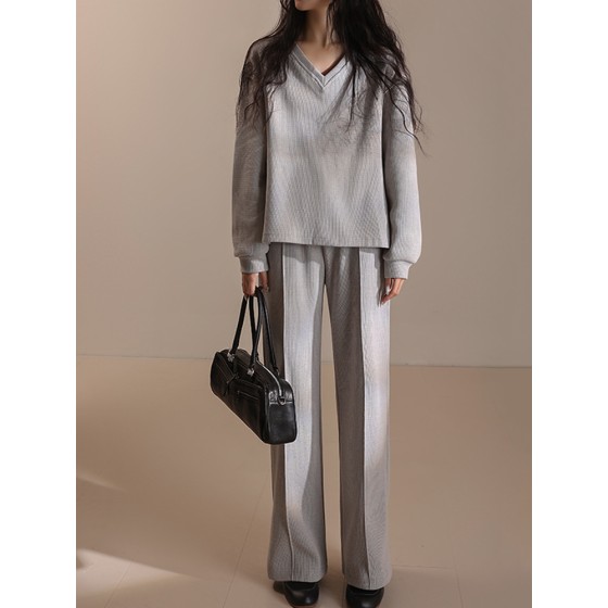 春秋薄款V领卫衣裤子套装阔腿裤华夫格慵懒时尚休闲宽松ZG5501