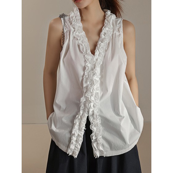 夏季女无袖花边小衫V领木耳边前后两穿马甲马来白色上衣MD5160