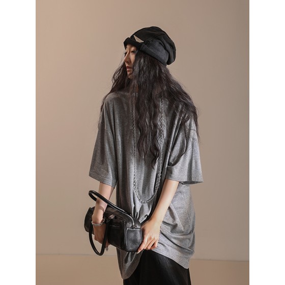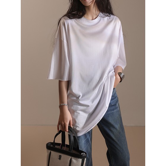 春夏轻薄圆领短袖T恤透气舒适日韩宽松休闲大码中长款上衣MD5136